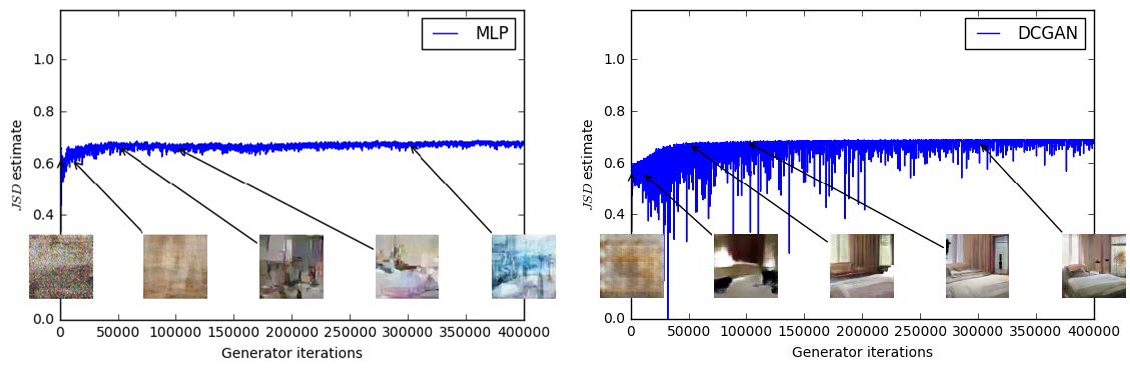 上图中 Y 轴绘制的为 $\dfrac{1}{2} L \left(D, \theta_g\right) + \log 2$,因为 $-2 \log 2 \leq L \left(D, \theta_g\right) \leq 0$,因此我们可得 $0 \leq \dfrac{1}{2} L \left(D, \theta_g\right) + \log 2 \leq \log 2$。从图中我们可以看出,针对两种不同的情况,其值均很快的逼近最大值 $\log 2 \approx 0.69$,当接近最大值的时候,判别器将具有接近于零的损失,此时我们可以发现,尽管 JS 散度很快趋于饱和,但 DCGAN 生成器的效果却仍在不断的变好,因此,使用 JS 散度作为判别其的目标就显得不是很合适。