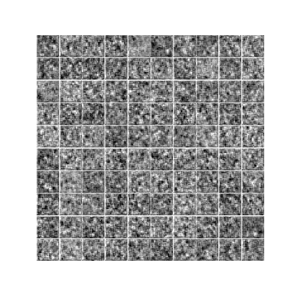 下图中我们展示了利用 MNIST 数据集,进行 30000 次的迭代,每 1000 次截取 100 张生成器利用相同噪音数据伪造的图像,最后合成的一张生成图片的变化动图。