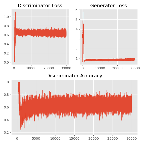 在整个训练过程中,我们分别记录了判别器和生成器的损失的变化,以及判别器的准确率的变化,如下图所示: