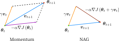 $$ \begin{equation} \begin{split} \boldsymbol{v}_t &= - \alpha \nabla_{\boldsymbol{\theta}} J \left(\boldsymbol{\theta}_t + \gamma \boldsymbol{v}_{t-1}\right) + \gamma \boldsymbol{v}_{t-1} \\ \boldsymbol{\theta}_t &= \boldsymbol{\theta}_{t-1} + \boldsymbol{v}_t \end{split} \end{equation} $$