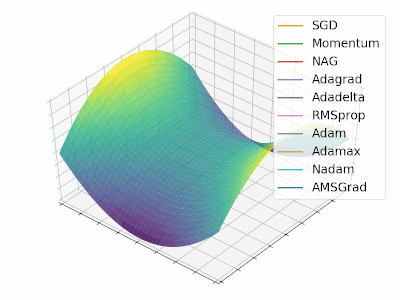 右图为包含鞍点的一个三维图像,图像函数为 $z = x^2 - y^2$,从图中可以看出 AdaGrad,Adadelta 和 RMSprop 算法能够相对很快的逃离鞍点,而 Momentum,NAG 和 SGD 则相对比较困难逃离鞍点。