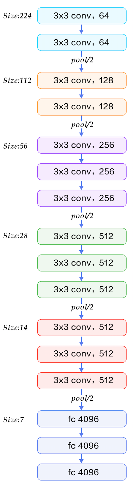 Simonyan, K., & Zisserman, A. (2014). Very deep convolutional networks for large-scale image recognition. arXiv preprint arXiv:1409.1556. ↩︎ ↩︎