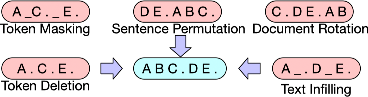 BART 采用了最小化破坏后的文档和原始文档之间的重构误差的方式进行预训练。不同于其他的一些去噪自编码器,BART 可以使用任意类型的文档破坏方式。极端情况下,当源文档的所有信息均丢失时,BART 就等价与一个语言模型。BART 中采用的文本破坏方式有:字符遮罩,字符删除,文本填充,句子重排,文档旋转,如下图所示: