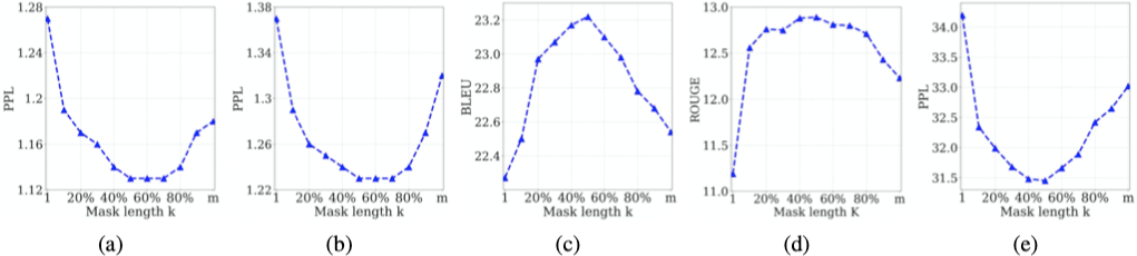 当 $k = 0.5 m$ 时,MASS 可以很好地平衡编码器和解码器的预训练。过度地偏向编码器($k=1$,masked LM in BERT)和过度地偏向解码器($k=m$,masked LM in GPT)均不能在下游的自然语言生成任务中取得很好的效果。