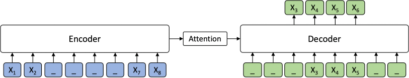 对于一个具有 8 个词条的序列,$x_3 x_4 x_5 x_6$ 被遮挡的示例如下: