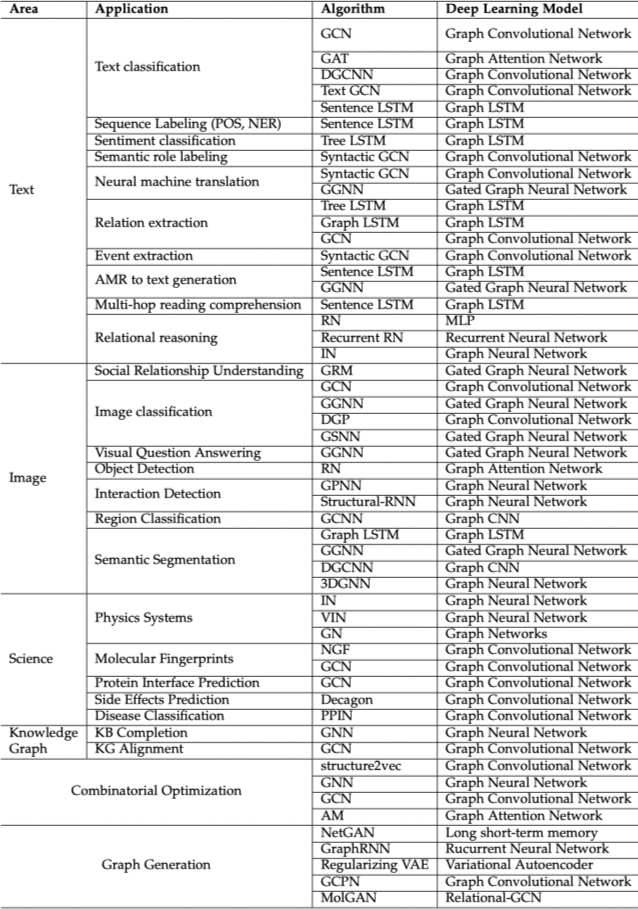 图神经网络已经被应用在监督、半监督、无监督和强化学习等多个领域。下图列举了 GNN 在不同领域内相关问题中的应用,具体模型论文请参考 Graph Neural Networks: A Review of Methods and Applications 原文 19。