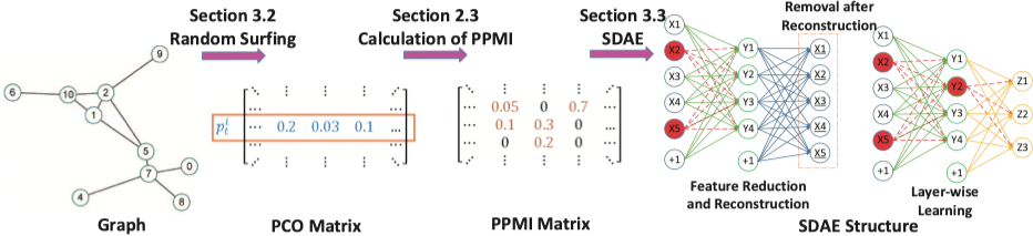 模型首先利用 Random Surfing 得到一个概率共现(PCO)矩阵,之后利用其计算得到 PPMI 矩阵,最后利用 SDAE 进行特征提取得到节点的向量表示。
