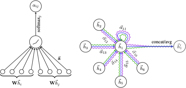 $$ \alpha_{i j}=\frac{\exp \left(\text { LeakyReLU }\left(\overrightarrow{\mathbf{a}}^{T}\left[\mathbf{W} \vec{h}_{i} \| \mathbf{W} \vec{h}_{j}\right]\right)\right)}{\sum_{k \in N_{i}} \exp \left(\text { LeakyReLU }\left(\overrightarrow{\mathbf{a}}^{T}\left[\mathbf{W} \vec{h}_{i} \| \mathbf{W} \vec{h}_{k}\right]\right)\right)} $$