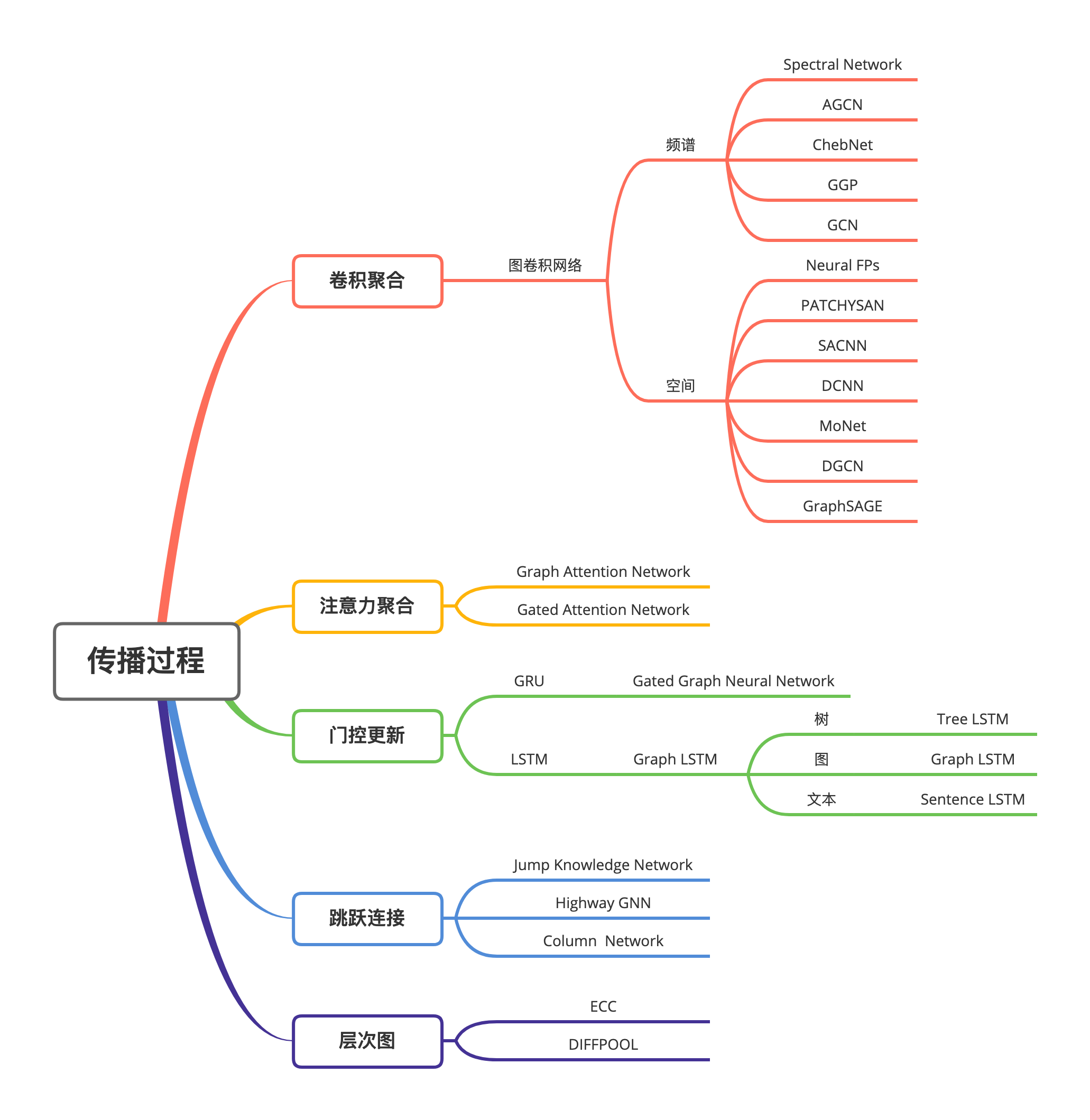 一些研究尝试利用门控机制(例如:GRU 或 LSTM)用于减少之前 GNN 模型在传播过程中的限制,同时改善在图结构中信息的长距离传播。GGNN 28 提出了一种使用 GRU 进行传播的方法。它将 RNN 展开至一个固定 $T$ 步,然后通过基于时间的传导计算梯度。传播模型的基础循环方式如下:
