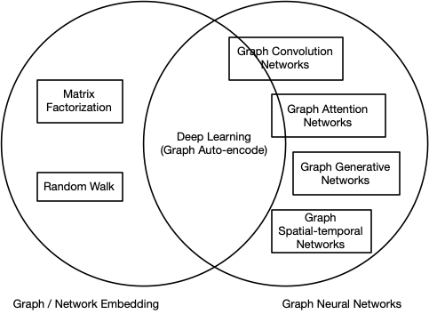 作为一个典型的非欧式数据,对于图数据的分析主要集中在节点分类,链接预测和聚类等。对于图数据而言,图嵌入(Graph / Network Embedding)和图神经网络(Graph Neural Networks, GNN)是两个类似的研究领域。图嵌入旨在将图的节点表示成一个低维向量空间,同时保留网络的拓扑结构和节点信息,以便在后续的图分析任务中可以直接使用现有的机器学习算法。一些基于深度学习的图嵌入同时也属于图神经网络,例如一些基于图自编码器和利用无监督学习的图卷积神经网络等。下图描述了图嵌入和图神经网络之间的差异: