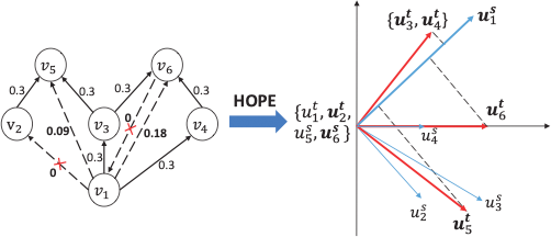 HOPE 9 对于每个节点最终生成两个嵌入表示:一个是作为源节点的嵌入表示,另一个是作为目标节点的嵌入表示。模型通过近似高阶相似性来保留非对称传递性,其优化目标为: