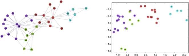 网路表示学习是指学习得到网络中节点的低维向量表示,形式化地,网络表示学习的目标是对每个节点 $v \in V$ 学习一个实值向量 $R_v \in \mathbb{R}^k$,其中 $k \ll |V|$ 表示向量的维度。经典的 Zachary’s karate club 网络的嵌入可视化如下图所示: