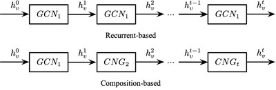 为了使节点可以感知更深和更广的范围,通常的做法是将多个图卷积层堆叠在一起。根据堆叠方式的不同,基于空间的图卷积可以进一步分为两类:基于循环(Recurrent-based)和基于组合(Composition-based)的。基于循环的方法使用相同的图卷积层来更新隐含表示,基于组合的方式使用不同的图卷积层更新隐含表示,两者差异如下图所示: