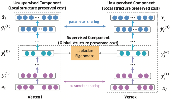 对于一阶相似度,模型利用了一个监督学习模块最小化节点在隐含空间中距离。损失函数如下: