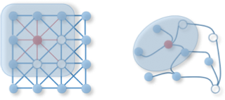 每个像素同周围的像素相连,以 $3 \times 3$ 为窗口,每个节点被 8 个邻居节点所包围。通过对中心节点和周围邻居节点的像素值进行加权平均来应用一个 $3 \times 3$ 大小的滤波器。由于邻居节点的特定顺序,可以在不同位置共享权重。同样对于一般的图,基于空间的图卷积通过对中心和邻居节点的聚合得到节点新的表示。
