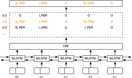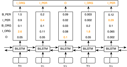 虽然我们在上例中得到了正确的结果,但通常情况下并非如此。对于如下的示例,预测结果为 I_ORG, I_PER, O, I_ORG, I_PER,这显然是不正确的。