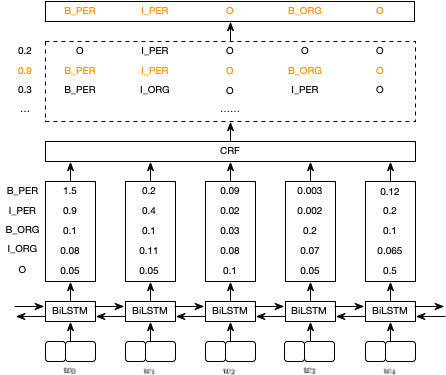 BiLSTM 层的输出为每个标签的分数,对于 $w_0$,BiLSTM 的输出为 1.5 (B_PER),0.9 (I_PER),0.1 (B_ORG),0.08 (I_ORG) 和 0.05 (O),这些分数为 CRF 层的输入,如下图所示: