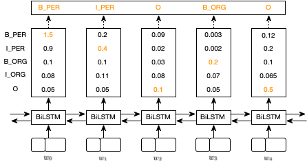 经过 CRF 层后,具有最高分数的预测序列被选择为最优预测结果。如果没有 CRF 层,我们可以直接选择 BiLSTM 层输出分数的最大值对应的序列为预测结果。例如,对于 $w_0$,最高分数为 1.5,对应的预测标签则为 B_PER,类似的 $w_1, w_2, w_3, w_4$ 对应的预测标签为 I_PER, O, B_ORG, O,如下图所示: