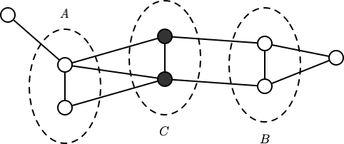 全局马尔可夫性:设结点结合 $A, B$ 是在无向图 $G$ 中被结点集合 $C$ 分开的任意结点集合,如下图所示。结点集合 $A, B$ 和 $C$ 所对应的随机变量组分别是 $Y_A, Y_B$ 和 $Y_C$。全局马尔可夫性是指给定随机变量组 $Y_C$ 条件下随机变量组 $Y_A$ 和 $Y_B$ 是条件独立的,即: