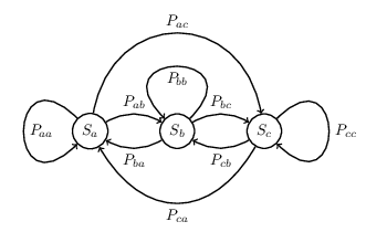 隐马尔可夫模型(Hidden Markov Model,HMM)是一个描述包含隐含未知参数的马尔可夫过程的统计模型。马尔可夫过程(Markov Process)是因俄国数学家安德雷·安德耶维齐·马尔可夫(Андрей Андреевич Марков)而得名一个随机过程,在该随机过程中,给定当前状态和过去所有状态的条件下,其下一个状态的条件概率分布仅依赖于当前状态,通常具备离散状态的马尔可夫过程称之为马尔可夫链(Markov Chain)。因此,马尔可夫链可以理解为一个有限状态机,给定了当前状态为 $S_i$ 时,下一时刻状态为 $S_j$ 的概率,不同状态之间变换的概率称之为转移概率。下图描述了 3 个状态 $S_a, S_b, S_c$ 之间转换状态的马尔可夫链。
