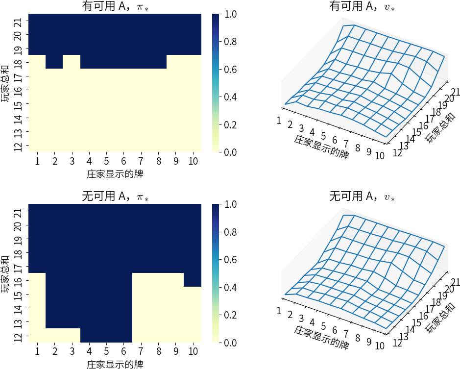 以二十一点游戏为例,每一局可以看作一幕,胜、负、平分别获得收益 $+1, -1, 0$。每局游戏进行中的收益都为 $0$,并且不打折扣($\gamma = 1$),最终的收益即为整个游戏的回报。玩家的动作为要牌(Hit)或停牌(Stand),状态则取决于玩家的牌和庄家显示的牌。假设所有牌来自无穷多的一组牌(即每次取出的牌都会再放回牌堆)。如果玩家手上有一张 A,可以视作 11 而不爆掉,那么称这张 A 为可用的,此时这张牌总会被视作 11。因此,玩家做出的选择只会依赖于三个变量:他手牌的总和(12-31),庄家显示的牌(A-10),以及他是否有可用的 A,共计 200 个状态。