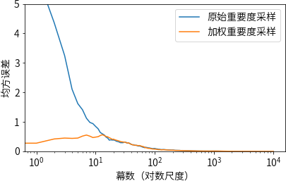 为一种加权的重要度采样,称之为加权重要度采样,如果分母为零,则式 $\ref{eq:weighted-importance-sampling}$ 的值也为零。式 $\ref{eq:ordinary-importance-sampling}$ 得到的结果在期望上是 $v_{\pi} \left(s\right)$ 的无偏估计,但其值可能变得很极端,式 $\ref{eq:weighted-importance-sampling}$ 的估计是有偏的,但其估计的方差可以收敛到 0。
