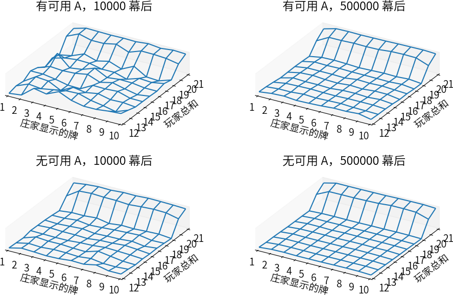 考虑如下策略,玩家在手牌点数之和小于 20 时均要牌,否则停牌。通过该策略多次模型二十一点游戏,并且计算每一个状态的回报的平均值。模拟结果如下: