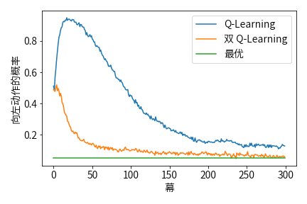 因此,任何一个以向左开始的轨迹的期望回报均为 -0.1,则在 A 这个状态中根本就不该选择向左。然而使用 $\epsilon-$ 贪心策略来选择动作的 Q-Learning 算法会在开始阶段非常明显地选择向左这个动作。即使在算法收敛到稳定时,它选择向左这个动作的概率也比最优值高了大约 5%,如下图所示: