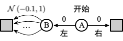 我们用下例进行说明,在如下这个 MDP 中有两个非终止节点 A 和 B。每幕都从 A 开始并选择向左或向右的动作。向右则会立即转移到终止状态并得到值为 0 的收益和回报。向左则会是状态转移到 B,得到的收益也是 0。而在 B 这个状态下有很多种可能的动作,每种动作被选择后会立刻停止并得到一个从均值为 -0.1 方差为 1.0 的分布中采样得到的收益。