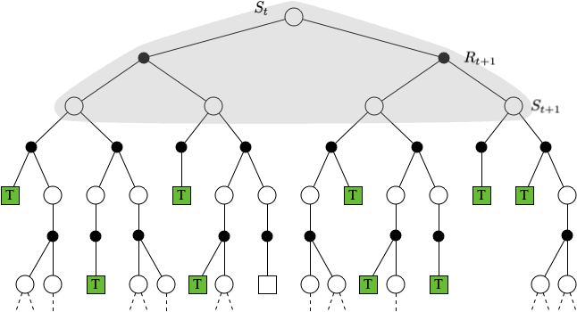 $$ \textbf{DP} \quad V\left(S_{t}\right) \leftarrow \mathbb{E}_{\pi}\left[R_{t+1}+\gamma V\left(S_{t+1}\right)\right] $$