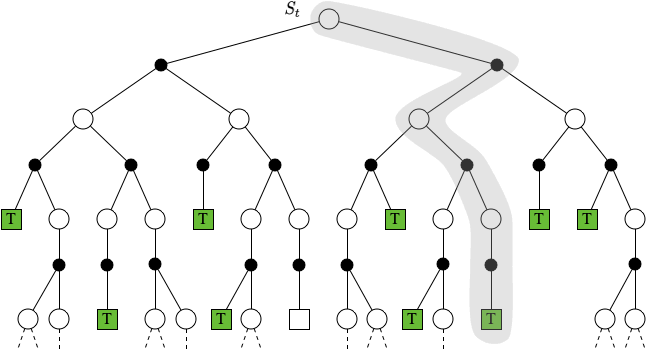 $$ \textbf{MC} \quad V\left(S_{t}\right) \leftarrow V\left(S_{t}\right)+\alpha\left(G_{t}-V\left(S_{t}\right)\right) $$