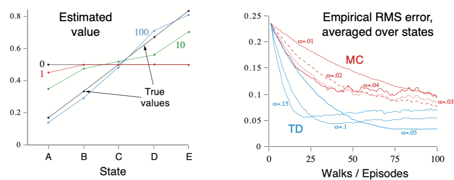 上图左侧显示了在经历了不同数量的幕采样序列之后,运行一次 TD(0) 所得到的价值估计。在 100 幕后,估计值已经非常接近真实值了。上图右侧显示了不同的 $\alpha$ 情况下学习到的价值函数和真实价值函数的均方根(RMS)误差,对于所有的 $s$,近似价值函数都被初始化为中间值 $V \left(s\right) = 0.5$,显示的误差是 5 个状态上运行 100 次的平均误差。