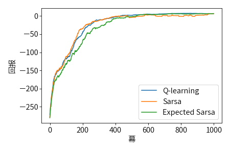 分别利用 Sarsa,Q-Learning 和 期望 Sarsa 三种不同的算法训练模型,我们以 100 幕作为窗口计算平均回报,前 1000 个平均回报的对比结果如下图所示: