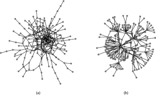 上图 (a) 给出了一个小型的同配混合网络,其核心/边缘结构明显,上图 (b) 给出了一个小型异配混合网络,通常不具备核心/边缘结构,但顶点的分布更加均匀。