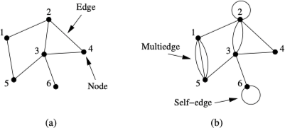 网络(network)也称为图(graph),是一个由多个顶点(vertex)及连接顶点的边(edge)组成的集合。在网络中,我们通常用 $n$ 表示顶点的数目,用 $m$ 表示边的数目。在大多数网络中两个顶点之间都只有一条边,极少数情况下,两个顶点之间有多条边,称之为重边(multiedge)。在极特殊情况下,还会存在连接到顶点自身的边,称之为自边(self-edge)。既没有自边也没有重边的图称之为简单网络(simple network)或简单图(simple graph),存在重边的网络称之为重图(multigraph)。相关概念示例如下: