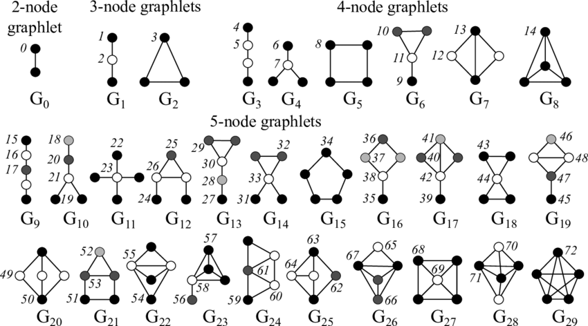 Graphlets 是对 Motif 的扩展,Motif 是从全局的角度发现模式,而 Graphlets 是从局部角度出发。Graphlets 是连接的非同构子图,这里要求子图为导出子图。下图展示了节点数为 2 至 5 的所有 Graphlets: