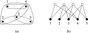在某些类型的网络中,一些边会同时连接多个顶点。例如:创建一个社会网络,用来表示一个大规模社区中的各个家庭。每个家庭都可能会有两名或多名成员,因此表示这些家庭之间关系的做好方法就是使用一种广义边来同时连接多个顶点。这样的边称之为超边(hyperedge),含有超边的网络称之为超图(hypergraph)。下图 (a) 表示一个小型超图,其中超边用环的形式表示。