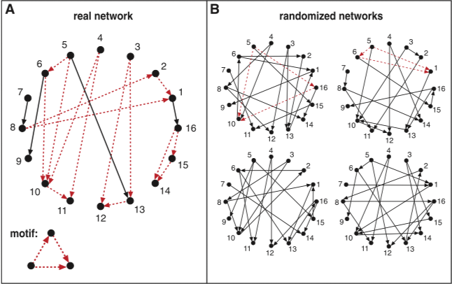 Motif 1 被定义为反复出现的重要连接模式。这些模式在真实的网络中要比随机网络中出现的更加频繁,如下图所示: