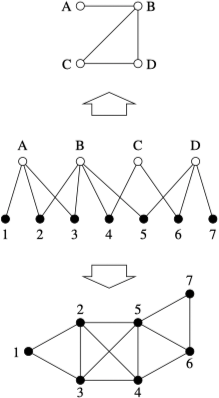 群组内成员之间的关系可以用超图中的超边表示,也可以等价地用更方便的二分图(bipartite network)表示。这种网络中有两类顶点,一类顶点代表原始顶点,另一类顶点则表示原始顶点所属的群组。