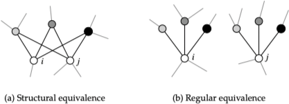 社会网络分析的另一个核心概念是顶点之间的相似性。构造网络相似性的测度有两种基本方法:结构等价(structural equivalence)和规则等价(regular equivalence),如下图所示: