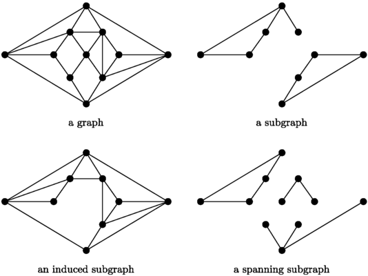 $G'$中所有顶点和边均包含于原图$G$中,即$E' \in E, V' \in V$。 - 生成子图(spanning subgraph):