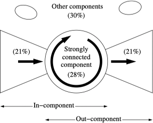 每个连通分支拥有外向分支(即从强连通分支中的任意顶点出发,沿着有向路径能够到达的所有顶点的集合)和内向分支(即沿着有向路径能够到达强连通分支的所有顶点的集合)。利用**“领结”图**可以很好地刻画有向网络的总体情况,万维网的“领结”图如下所示: