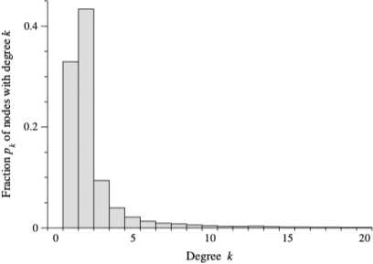 根据度 $k$ 描述出大型网络的度分布有着非常重要的作用,下图给出了 Internet 的度分布:
