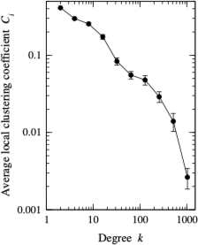 随着度的增加,局部聚类系数不断减少,这种现象的一个可能的解释是顶点分成紧密的群组或社团,同一个群组内部的顶点之间连接较多。在表现出此类行为的网络中,属于小型群组的顶点的度较小,因为这种群组的成员也相对较少,但在较大的群组中的顶点的度较大。同时,小型群组中的顶点的局部聚类系数较高。出现这种情况是因为将每个群组与网络的其余部分隔离开之后,每个群组大体上相当于一个小型网络,较小的网络会有更大的聚类系数。当对不同规模的网络取平均之后,会发现度小的顶点具有较高的聚类系数,如下图所示: