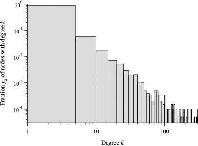 以 Internet 为例,下图给出了度分布的一个有趣特征,下图使用了对数标度重新绘制了上图的直方图: