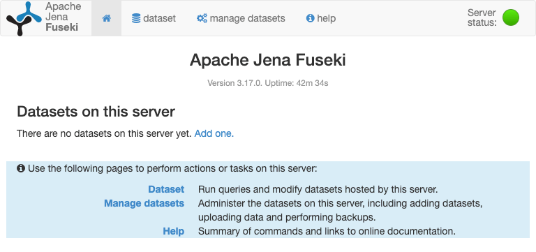 以 Apache Tomcat 作为容器来安装 Apache Jena Fuseki,下载最新版的 Apache Jena Fuseki 并解压,将其中的 fuseki.war 复制到已经安装并运行的 Apache Tomcat 的 webapps 路径下。安装完毕后,进入 http://127.0.0.1:8080/fuseki 即可使用 Apache Jena Fuseki。
