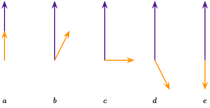 点积运算接收两个向量,并输出一个标量。对于给定长度但方向不同的两个向量而言,点积有几种情况:$a$ 最大正值;$b$ 正值;$c$ 零;$d$ 负值;$e$ 最小负值,如下图所示:
