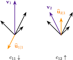 左侧的紫色输出 $\mathbf{v}_1$ 和橙色输入 $\widehat{\mathbf{u}}_{1|1}$ 指向相反的方向,这意味着他们的点积是一个负数,从而路由系数 $c_{11}$ 减少;右侧的紫色输出 $\mathbf{v}_2$ 和橙色输入 $\widehat{\mathbf{u}}_{2|1}$ 指向相同的方向,从而路由系数 $c_{12}$ 增加。在所有高层胶囊及其所有输入上重复该过程,得到一个路由系数集合,达成了来自低层胶囊的输出与高层胶囊的输出的最佳匹配。