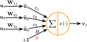 | Weighting | $\mathbf{s}_{j}=\sum_{i} c_{i j} \widehat{\mathbf{u}}_{j \mid i}$ | $a_{j}=\sum_{i} w_{i} x_{i}+b$ | |