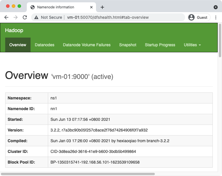 通过 http://vm-01:50070 可以进入 Hadoop Web 页面: